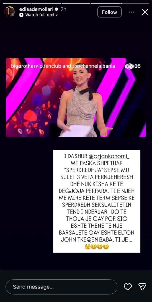 Në një shkrim të publikuar në Instagram Story, Edisa ka përdorur tone ironike dhe akuza personale ndaj opinionistit. Ajo shprehet: